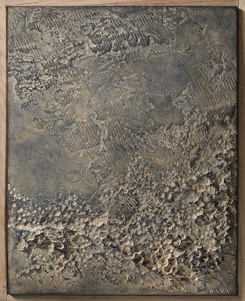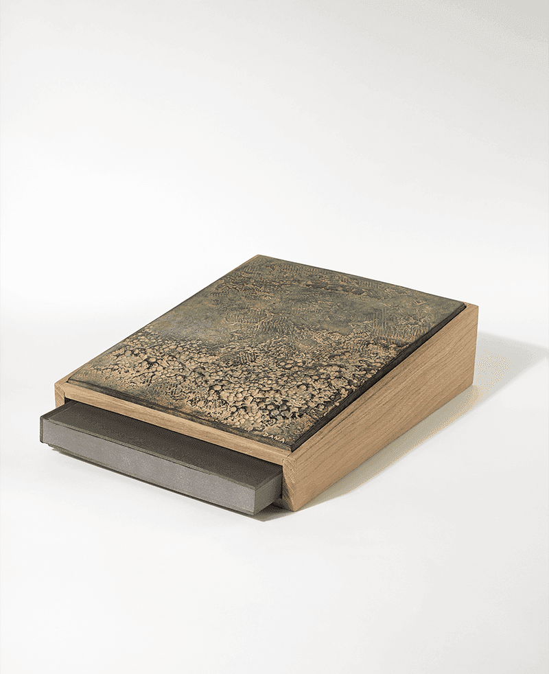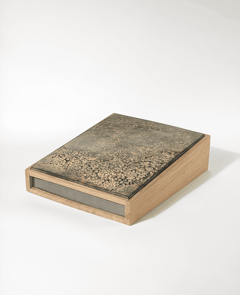 A book object, composed of a bronze relief set into the top of an oak box. The book slides inside the box.